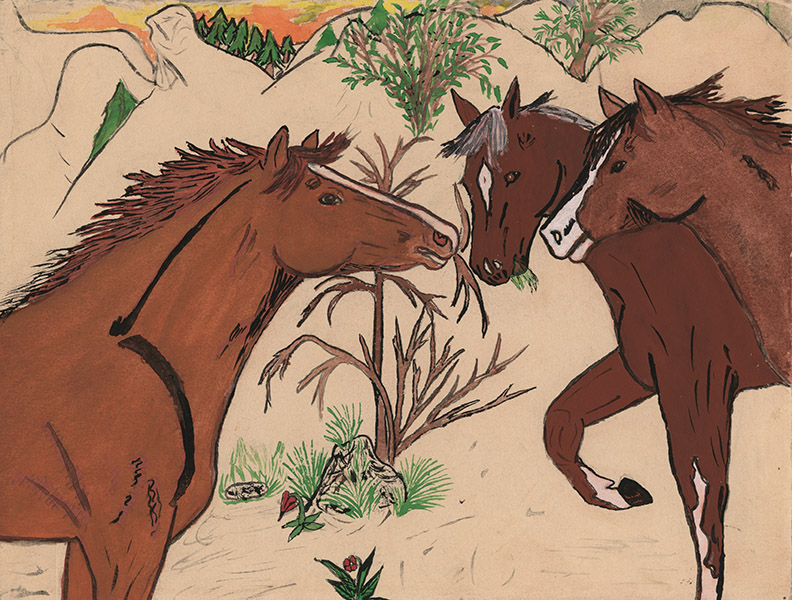 Our Lives Through Our Eyes: Nk’Mip Children’s Art was shown at the Kelowna Art Gallery from January 19 – April 14, 2019. This exhibition featured drawings and paintings on paper and hide that were created by students who attended the Nk’Mip Day School. These artworks are recognized as a significant record of students’ experiences and have contributed to contemporary cultural development.
