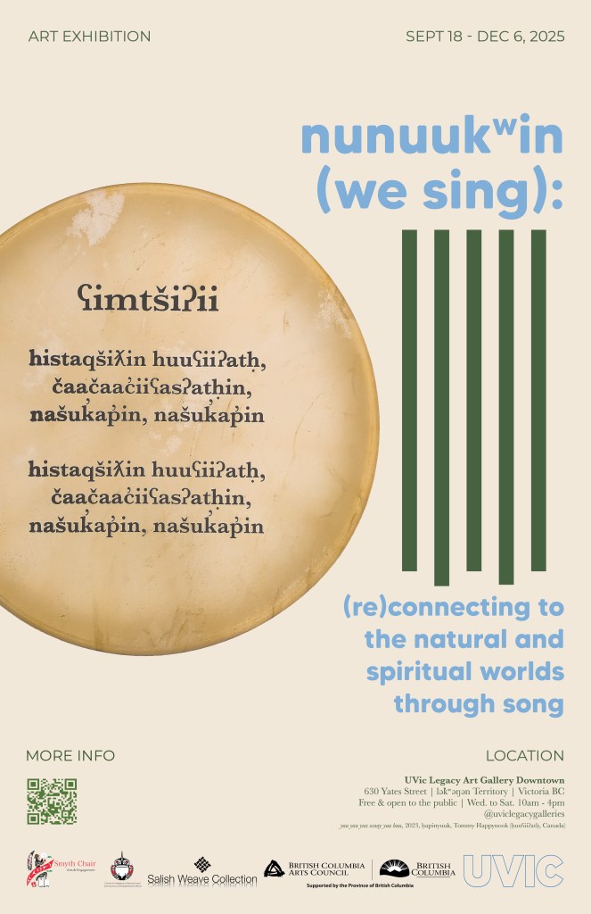 Curated by Tommy Happynook, this exhibition is based on his personal connections to his homelands and ancestors. It explores nuučaan̓uł songs as methodology in the continued production of nuučaan̓uł knowledge and teachings that are integral in the continual transfer between humans (čaačaac̓iiʕasʔat, huuʕiiʔat, nuučaan̓ułat, and non-nuučaan̓uł peoples) as well as between humans and the natural (ḥaḥuułi, čaačaac̓iiʕas) and the spiritual (yakʷiimit kʷiyiis nananiqsu) worlds.